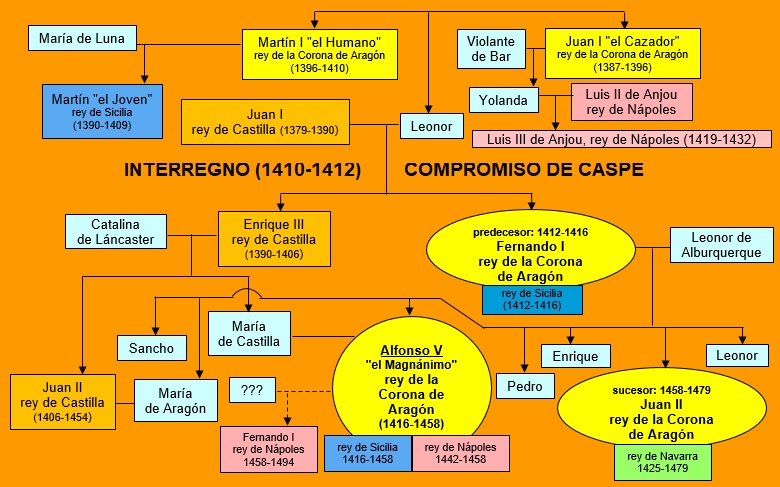En abril de 1416, Fernando I murió víctima de una enfermedad renal en Igualada (Barcelona) y fue sucedido por su hijo Alfonso V.