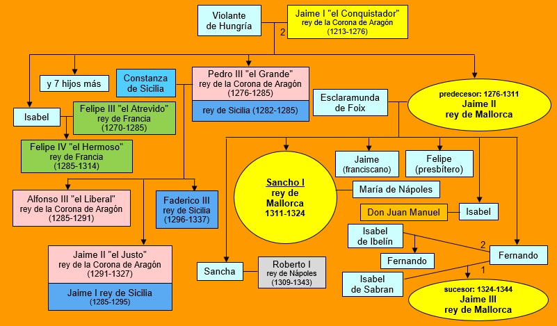 En 1316, Sancho I, aunque había tenido un hijo y cinco hijas naturales, no había conseguido engendrar un heredero legítimo después de doce años de matrimonio. Su hermano Fernando era el siguiente en la línea sucesoria, pero aquel año murió en una batalla en Morea (actual Grecia) defendiendo los derechos de su difunta esposa, Isabel de Sabrán, al principado de Acaya, también llamado de Morea. Dejaba un hijo llamado Jaime que había nacido en 1315 y otro póstumo, llamado Fernando tenido de unas segundas nupcias con Isabel de Ibelín.